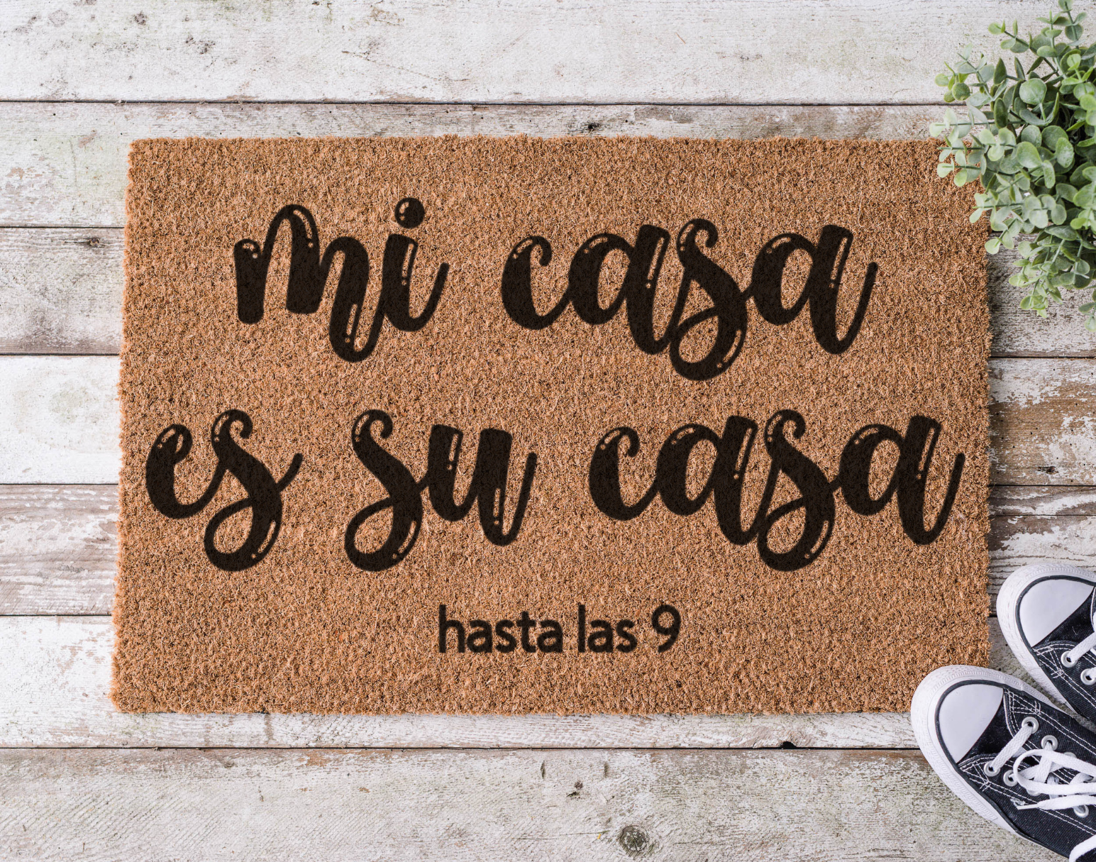 Set the rules at your doorstep with this "Mi Casa Es Su Casa… Hasta Las 9" doormat! Perfect for hosts who love company—but also love their quiet time, this witty and stylish entryway mat brings a fun twist to hospitality while keeping your home cozy and boundaries clear.