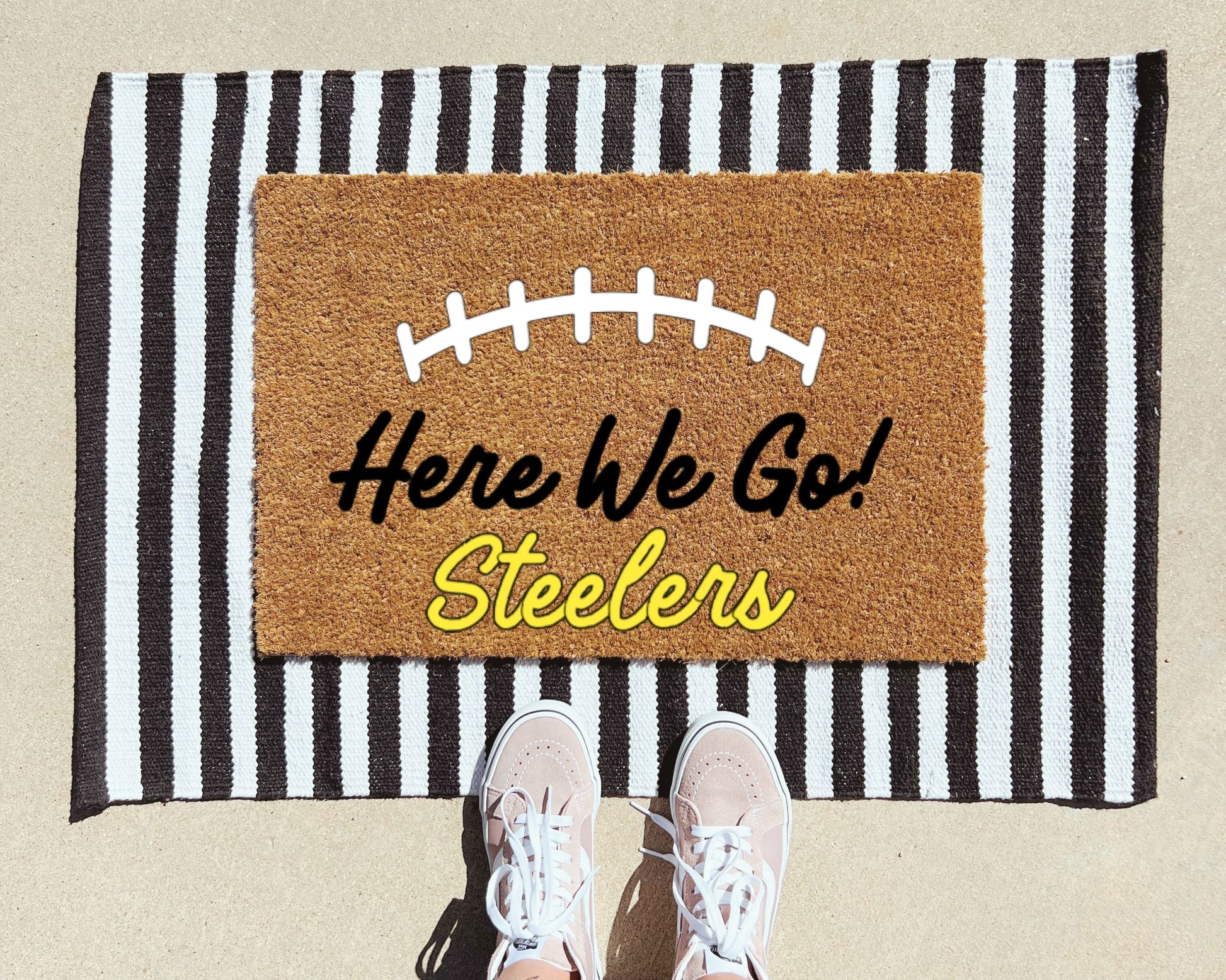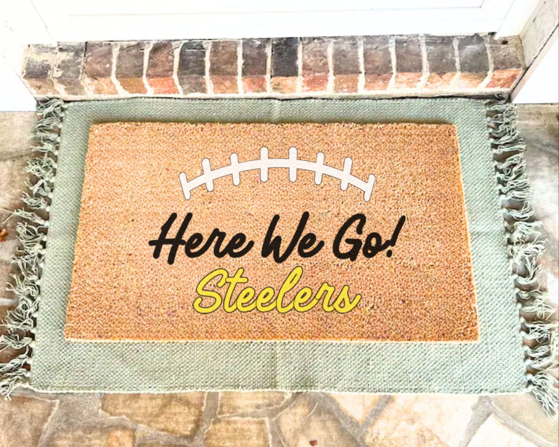 Bring the energy of game day straight to your doorstep with our Pittsburgh Steelers “Here We Go” Doormat. Perfect for die-hard Steelers fans, this hand-painted coir mat is durable, weather-resistant, and designed to keep dirt out while showing off your black and gold pride.